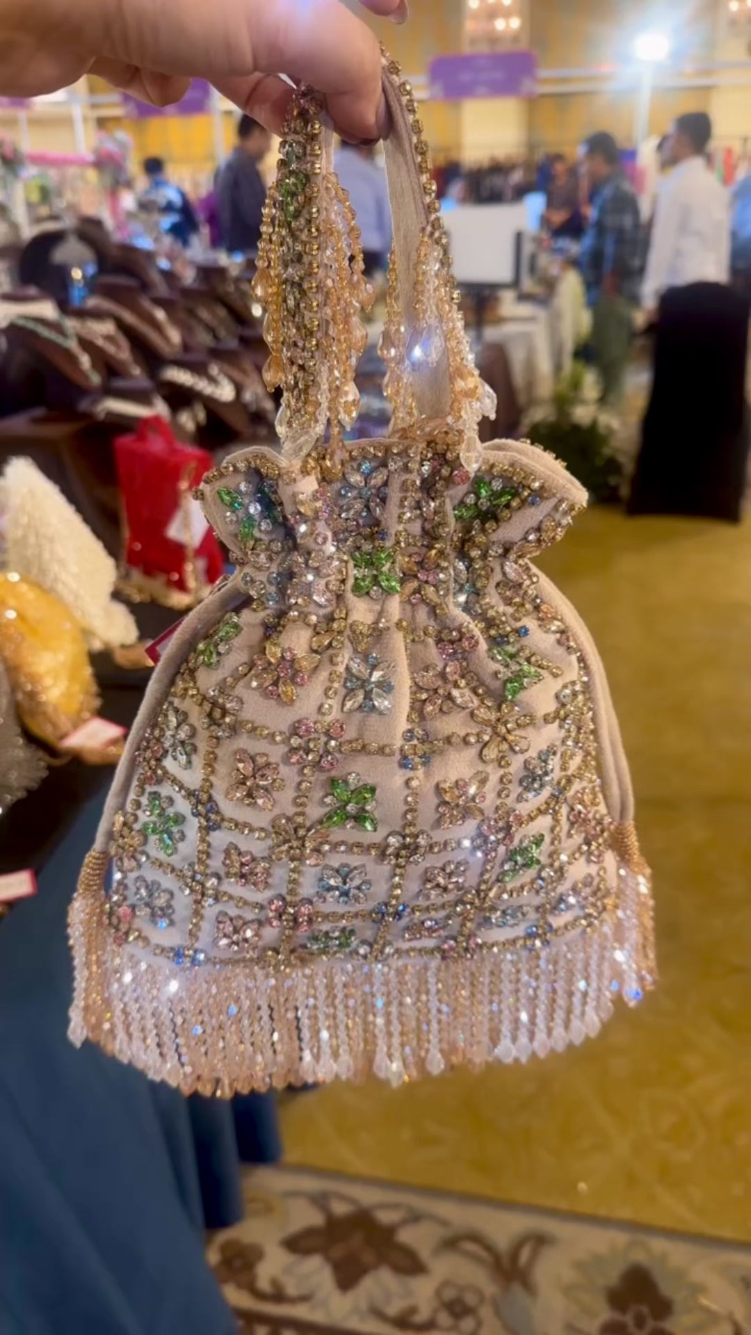 A gold velvet potli bag embroidered with pastel mutli coloured stones, in a criss cross floral design. Accompanied with matching crystal tassels and a fun fringe on the bottom, this bag is the perfect neutral accessory to match with all ensembles.